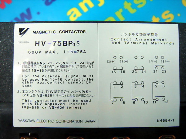 YASKAWA PLC MAGNETIC CONTACTOR HV75BP4S 600V MAX 1th=75A